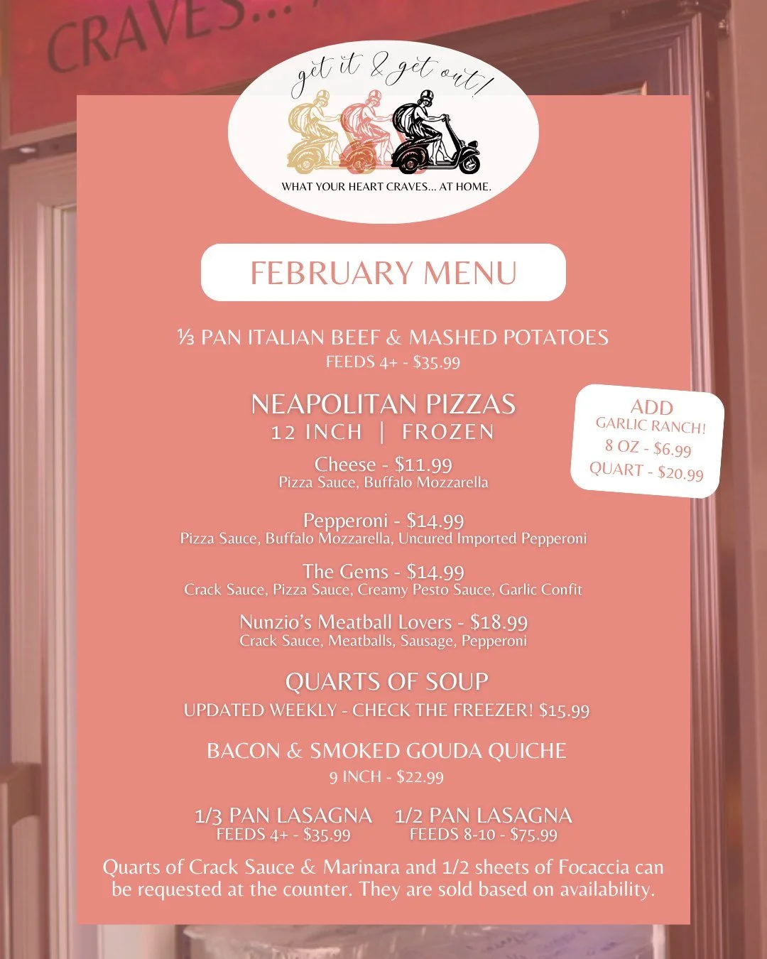 This is our Mama Milaβs spin on a Take Nβ Go. Every week you can come in during our OPEN hours and grab dinner from our fridges. There will be an assortment of our Sauces, Pastas, Lasagnas and specials from our At Home with Mama Mila segments! This is perfect if you have last minute guests or if youβre just craving Mama Milaβs but you really just want to skip the lines and eat it pantsless on your couch- havenβt we all been there?! These fridges will be FCFS and restocked weekly on Thursdays.